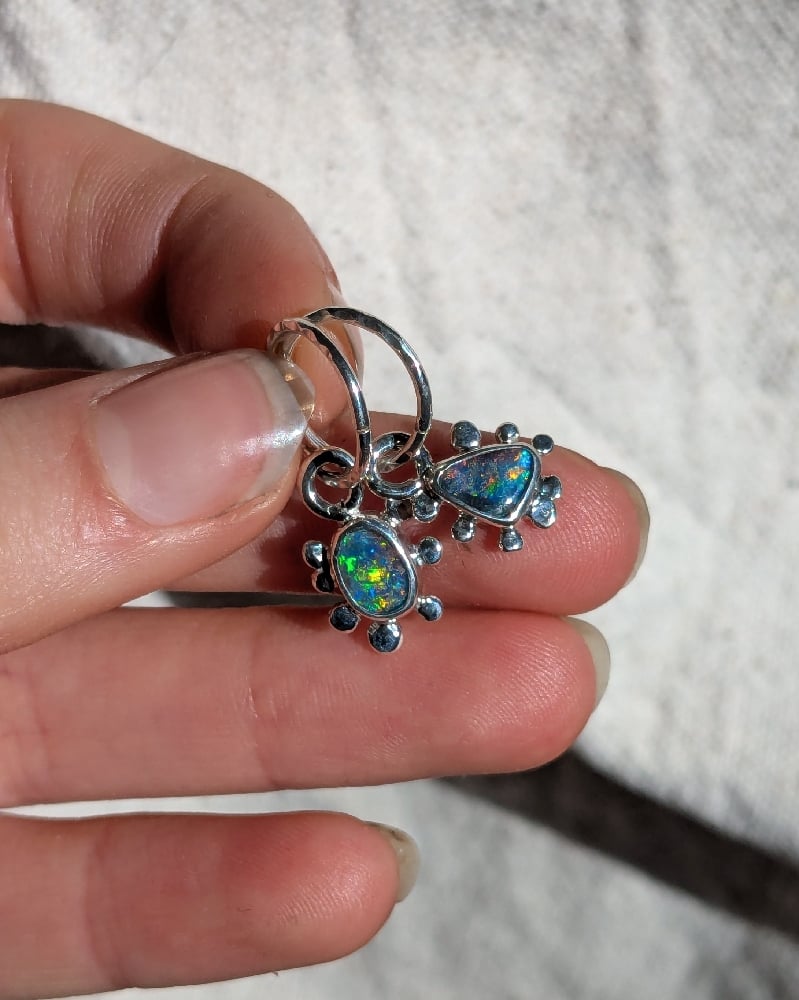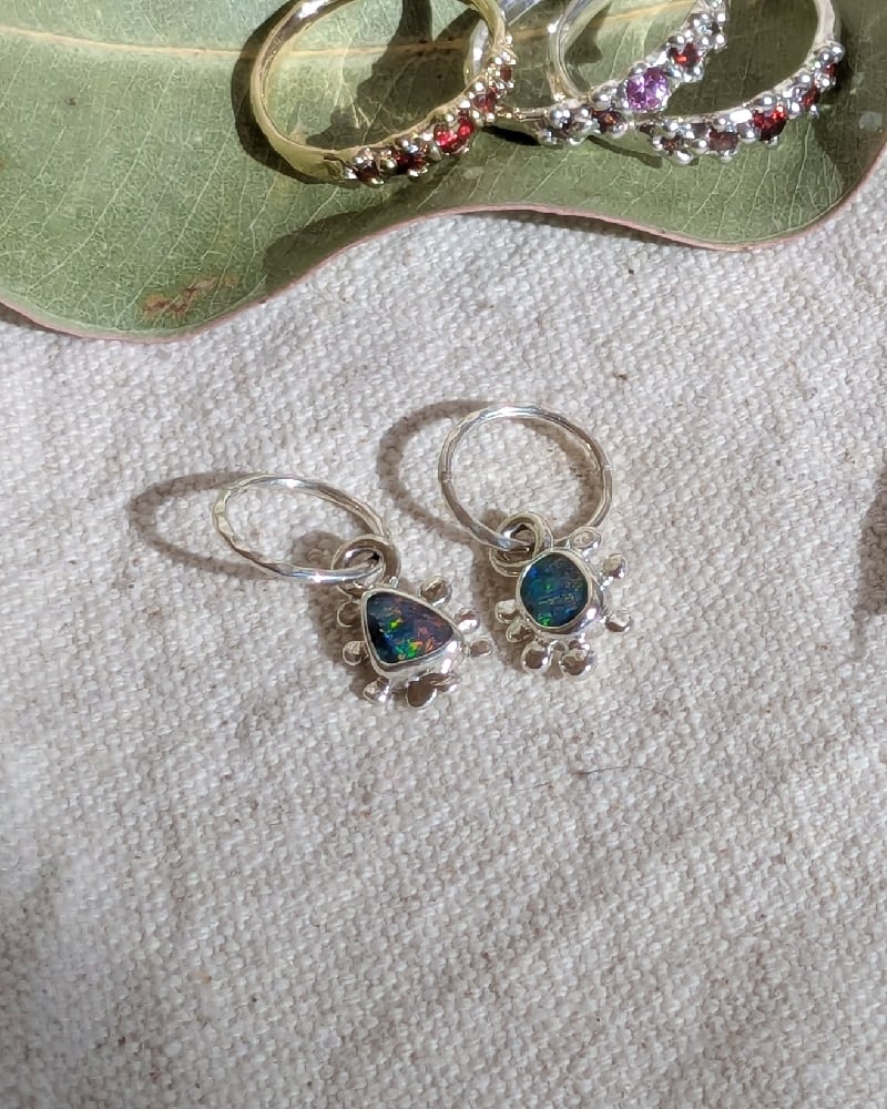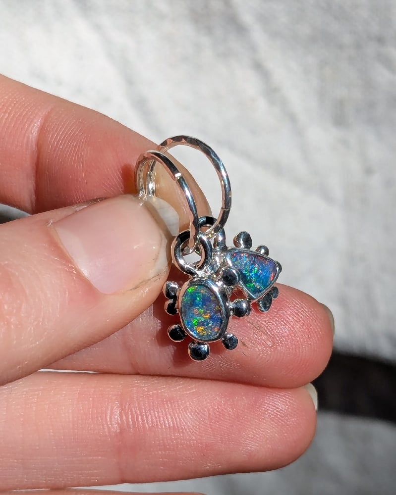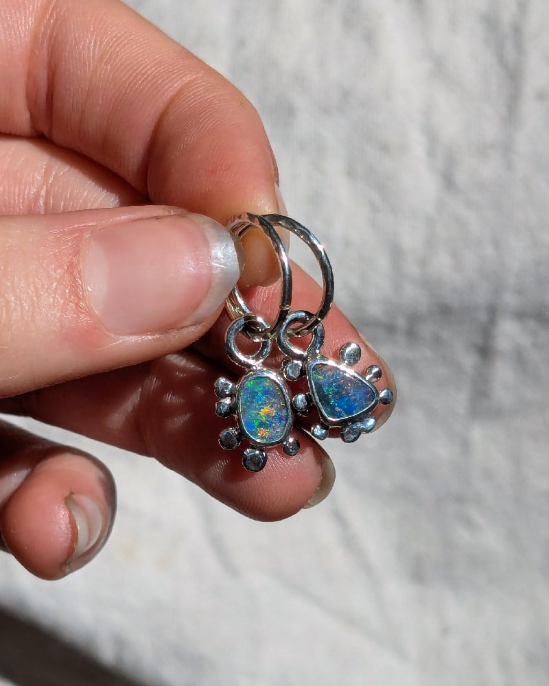 These earrings are handcrafted in solid sterling silver, featuring two Australian boulder opals.