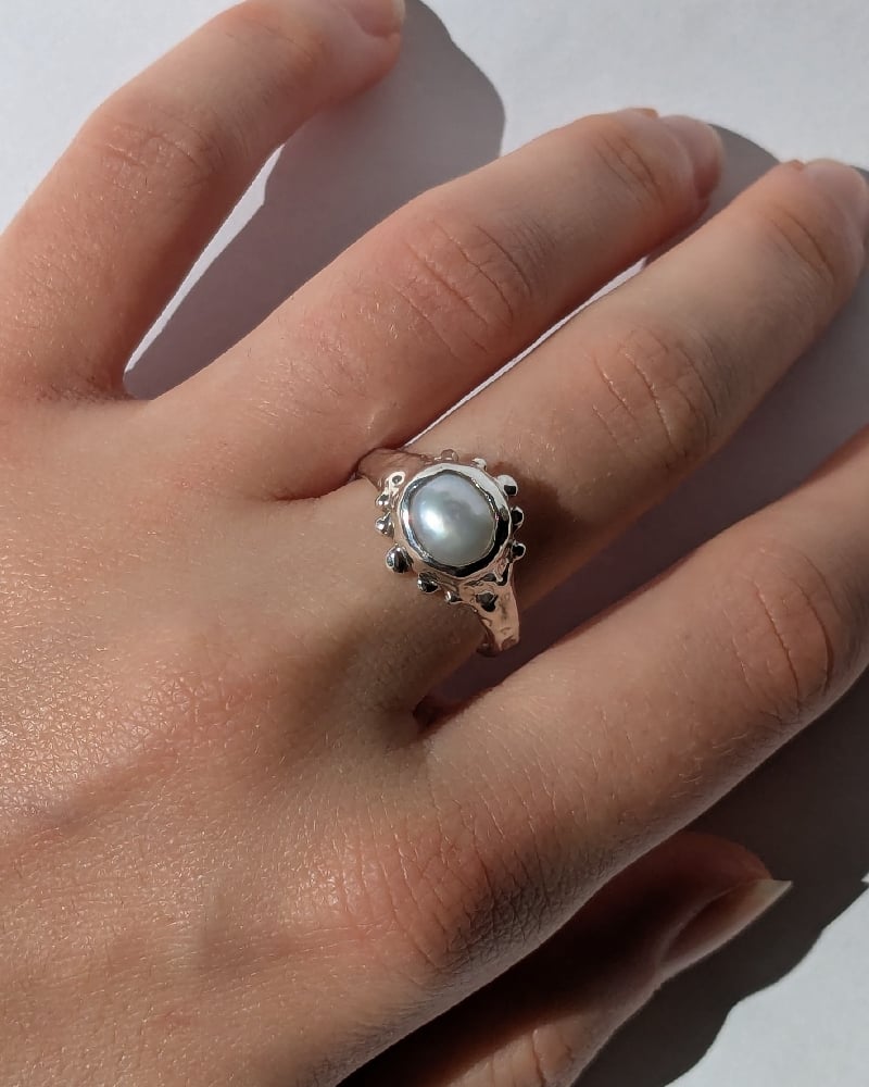 The Mari ring is handcrafted in solid sterling silver, featuring a natural reclaimed freshwater pearl.