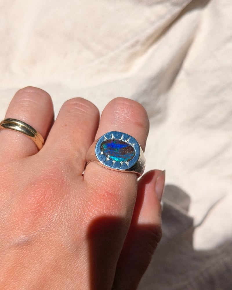 The Orion ring is handcrafted in solid sterling silver, featuring an Australian boulder opal.