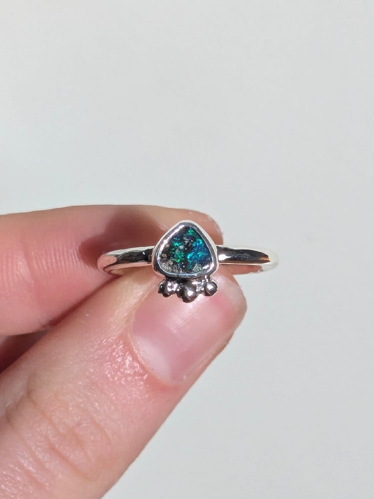The Pelagia Ring is handcrafted in solid sterling silver, featuring a natural solid Australian Boulder opal.